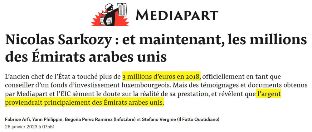 Nicolas Sarkozy lui-même fait l'objet de soupçons, même si les procédures judiciaires ne sont pas toutes abouties. Des conférences aux Émirats facturées au moins 100 000 euros pièce (Qui ne voudrait pas les conseils d'un tel professionnel ?). Environ 3 millions d'euros reçus en 2018, officiellement d'un fonds luxembourgeois (on aime toujours beaucoup les fonds luxembourgeois dans ce milieu européiste), qui sont soupçonnés de provenir en réalité du family office du président des Émirats, selon Mediapart.