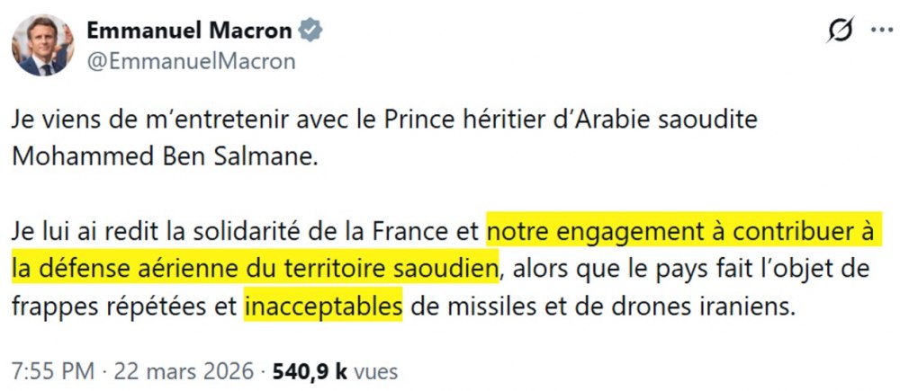 Et si Macron s'est conformé, en apparence, à ses obligations contractuelles, il a aussi fait le choix d'aller bien au-delà. Téléphoner au prince héritier d'Arabie saoudite Mohammed Ben Salmane pour lui réaffirmer "la solidarité de la France et notre engagement à contribuer à la défense aérienne du territoire saoudien", alors qu'aucun accord de défense ne nous lie à ce pays, et que l'Arabie saoudite venait juste d'autoriser les États-Unis à utiliser la base King Fahd pour frapper l'Iran, n'était pas une obligation. C'était un choix politique. Comme l'avait été, en sens inverse, le choix de l'Espagne de refuser toute utilisation de ses bases à l'armée américaine.