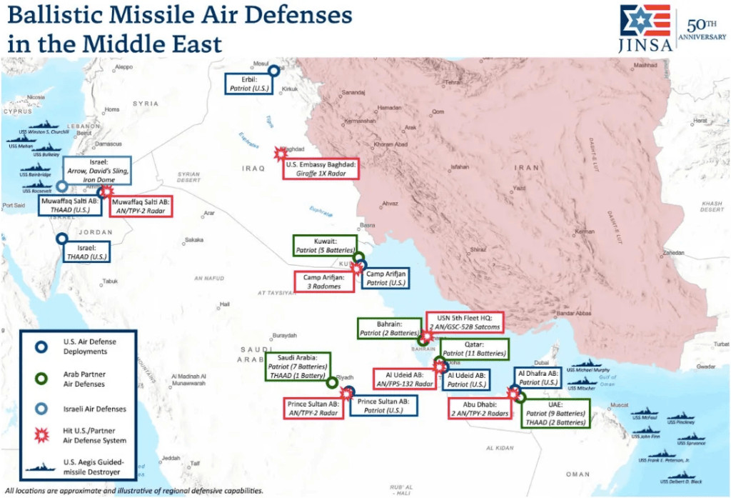 "La plupart des bases, ports et villes du Golfe se situent à proximité des zones de lancement iraniennes, ce qui réduit le temps dont disposent les forces de défense pour détecter, suivre et neutraliser les menaces. Les missiles balistiques iraniens lancés vers le Koweït, Bahreïn, le Qatar ou les Émirats arabes unis peuvent atteindre leurs cibles en trois à dix minutes, soit une fraction du temps déjà très court de 12 à 15 minutes nécessaire aux missiles balistiques pour atteindre Israël".