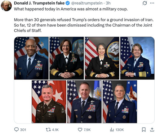 Ce qui rend la situation encore plus intéressante, c'est que, sur fond d'échec de la campagne militaire, Hegseth a procédé à une purge des hauts gradés de l'armée américaine. Cela a naturellement alimenté les rumeurs et les conclusions selon lesquelles une sorte de mutinerie se tramait en coulisses concernant les plans désastreux de Trump pour les opérations terrestres en Iran - bien que certains des responsables mentionnés ci-dessous aient été écartés il y a plusieurs semaines.