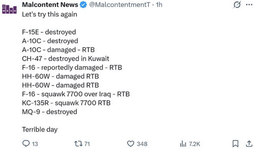 "Plusieurs incidents impliquant des aéronefs américains se sont produits dans la zone d'opérations du Commandement central américain (CENTCOM) au cours des dernières 24 heures : 1. Un F-15E "Strike Eagle" de l'US Air Force a été touché par des tirs iraniens et s'est écrasé en Iran. Les deux membres d'équipage ont survécu, l'un d'eux ayant été secouru. Une importante opération de recherche et de sauvetage est en cours pour retrouver le second. 2. Un hélicoptère HH-60W "Jolly Green II" de l'US Air Force, participant à une opération de sauvetage de l'équipage du F-15 abattu, a essuyé des tirs d'armes légères. Au moins un membre d'équipage a été blessé, mais l'appareil a pu regagner sa base. 3. Le pilote d'un A-10C "Thunderbolt II" de l'US Air Force s'est éjecté au-dessus du golfe Persique. L'Iran a revendiqué la destruction de l'appareil. Le pilote a été récupéré sain et sauf. 4. Un F-16C "Fighting Falcon" de l'US Air Force a brièvement été détecté sur les sites de suivi de vol, émettant le code transpondeur 7700 (urgence) au-dessus de l'Irak. 5. Un KC-135 "Stratotanker" de l'US Air Force émettait le code transpondeur 7700 (urgence) au-dessus d'Israël.