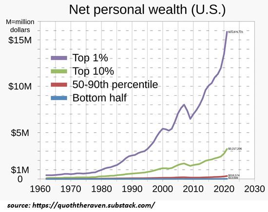3. The channeling of earned income from the workforce to the investor class will simply accelerate the trend of the past 50 years of income being diverted from the workforce (labor) to the investor class (capital), which is highly asymmetric in distribution, as the top 0.1% own the lion's share of this wealth and the rest is distributed in descending quantities to the top 10%.