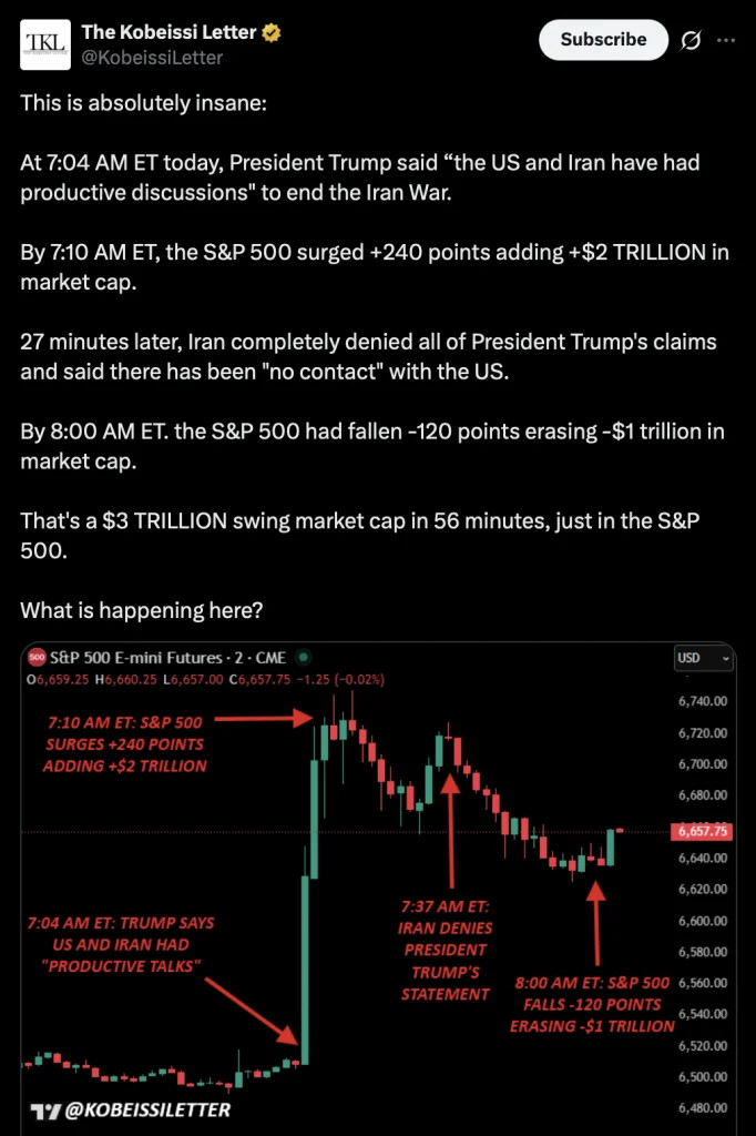The Kobeissi Letter (TKL) is a reasonably credible news outlet, showcasing technical and financial analysis on the S&P 500, Crude Oil, Natural Gas, Gold, Bonds and Options. TKL reports on "X" that within ten minutes from the time Trump said that the US and Iran had productive discussions on how to end the war (about 7 AM on 22 March), the S&P 500 surged 240 points, adding literally US$ 2 trillion to the market. About 27 minutes later, Iran completely denied all of Trump's claims, saying there has been no contact between Iran and the US.