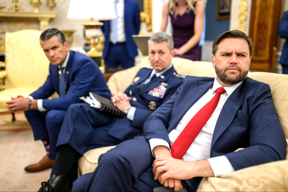 « Vance à droite, à la Maison-Blanche, avec, de gauche à droite, le secrétaire à la Guerre Pete Hegseth et le chef d'état-major des armées Dan Caine, le 18 août 2025. (Maison-Blanche / Daniel Torok) »