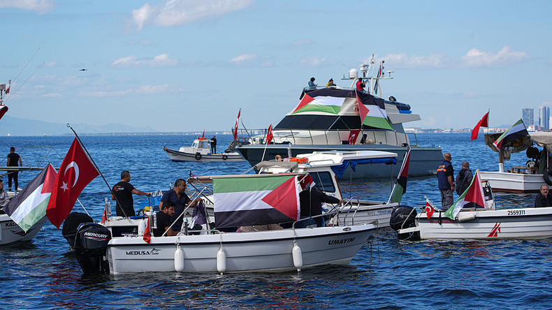 Des bateaux de la flotille Global Sumud ornés de drapeaux turcs et palestiniens. [Photo d'illustration]