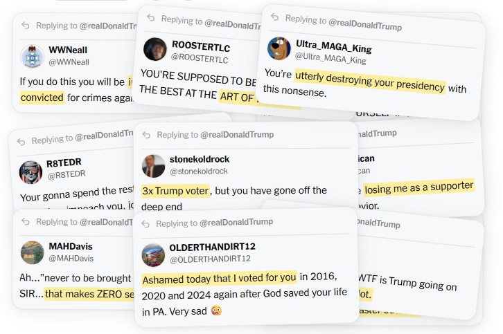 All of Trump's posts were made on his own Truth Social network, a tiny platform whose user base is barely 1% of Twitter's, almost entirely limited to Trump's most fervent and dedicated supporters. But huge numbers of them have now revolted over Trump's attack on Iran and especially these latest threats. An analysis by the New York Times found that more than half of all the responses to his warnings were deeply critical.