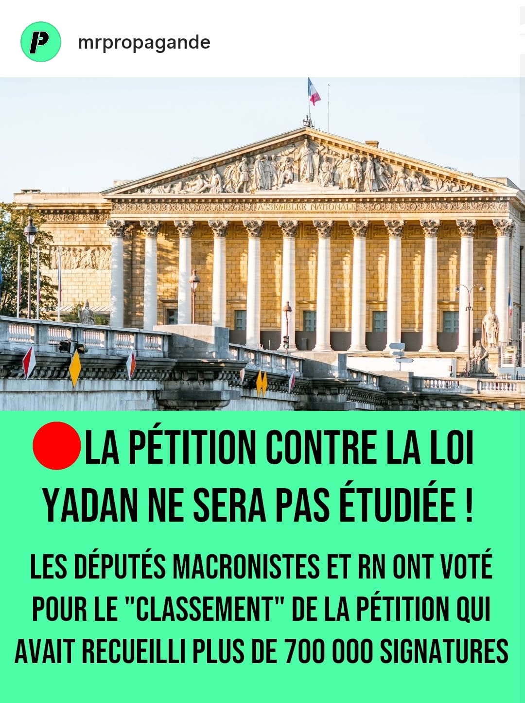 Le compteur, sur le site de l'Assemblée Nationale, se retrouve ainsi bloqué depuis la mi-journée à 707.957 signatures, plus personne ne pouvant signer ! Rappelons que règlementairement, dès qu'une pétition de ce type, c'est-à-dire organisée dans le cadre de l'Assemblée Nationale, atteint les 500.000 signatures, un débat public est de droit. Mais le droit, Yadan et ses complices s'assoient dessus, une fois de plus.