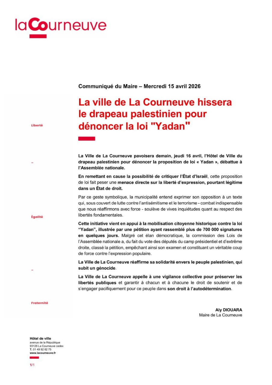 Puisque la pétition contre la loi Yadan est bloquée de manière anti-démocratique, la municipalité de La Courneuve annonce qu'elle manifestera sa protestation en hissant le drapeau palestinien