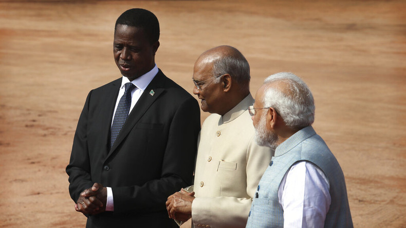 L'ex-président de la Zambie, Edgar Chagwa Lunguin, aux côtés du président indien Ram Nath Kovind et du Premier ministre Narendra Modi au palais présidentiel de New Delhi, le 21 août 2019. [Photo d'illustration]
