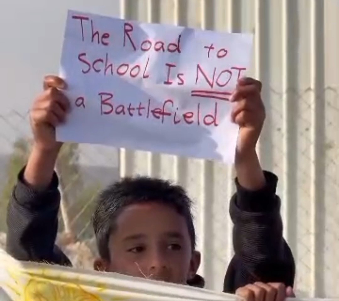 Lorsque les enfants ont tenté de passer malgré tout, ils ont été accueillis par des tirs de gaz lacrymogène. En réaction, les enfants se sont rassemblés pour manifester, exigeant un accès sûr à leur école et la sécurité dans leur vie quotidienne.