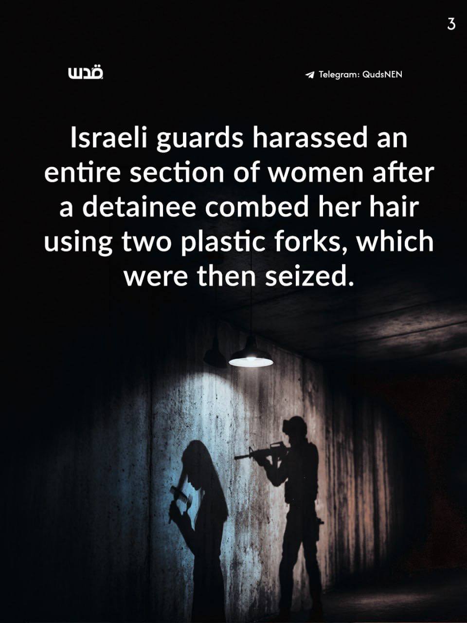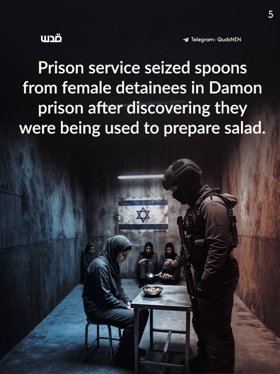 Dans les prisons israéliennes, les détenues subissent une réalité insoutenable, où l'ordinaire et le anodin deviennent des prétextes à la punition, et où le moindre détail ouvre la porte à de nouvelles formes de répression. Là, on invente des raisons à partir de rien : une cuillère confisquée, une fourchette usagée, un nom écrit sur un lit... Autant de prétextes qui justifient l'humiliation et les sévices. Chaque mesure arbitraire vise à briser l'esprit avant le corps.