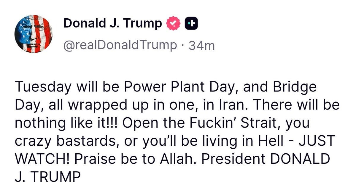 So on Easter Sunday morning, he reacted with volcanic fury, promising to destroy all of Iran's civilian infrastructure unless the strait were reopened. He then followed it up on Tuesday morning with an even more outrageous threat to annihilate all of Iranian civilization.