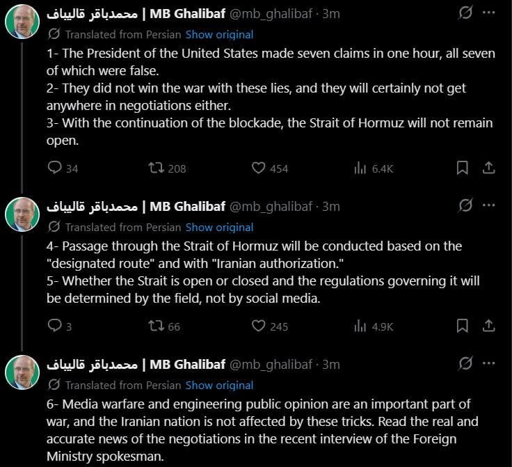 The Iranian speaker of parliament soon released a series of Tweets declaring that almost all of Trump's statements were false and that Iran had not changed any of its positions.