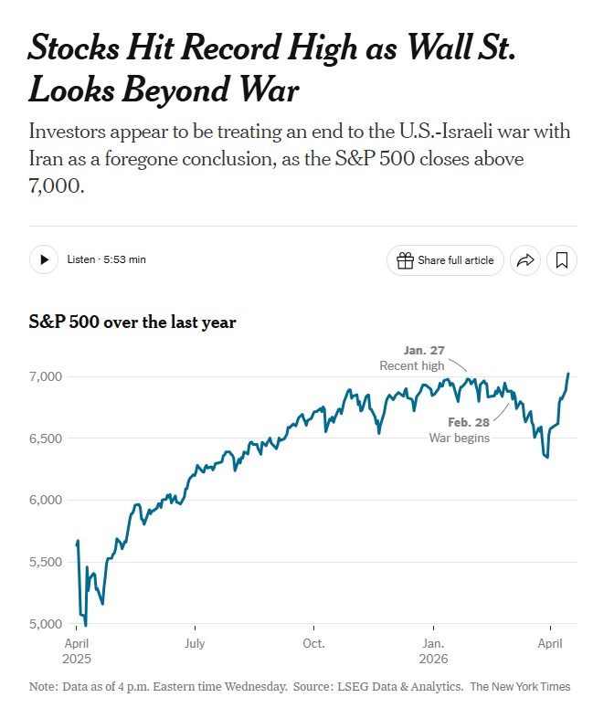 Perhaps I'm being overly conspiratorial, but many Zionist billionaires are determined to continue the war and they have a powerful incentive to temporarily mask the terrible economic consequences of the Iranian blockade of the Strait of Hormuz. So I wonder if they aren't manipulating the widely-quoted futures market prices, which might otherwise have already panicked Wall Street and forced Trump to end the conflict.