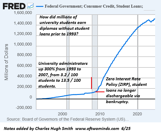 The flood of student debt that cannot be discharged via bankruptcy enabled the vast expansion of administrative staff: the monopoly on issuing credentials regardless of whether students learned anything of economic value enabled monopoly pricing and exploitation.