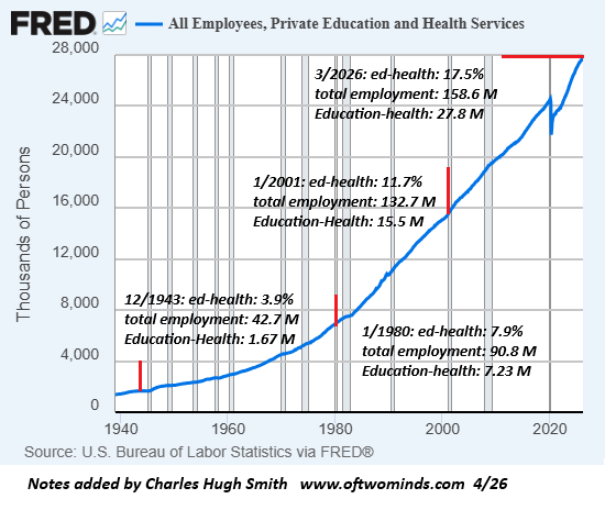It's now common knowledge that the sectors that have generated most of the new full-time service sector jobs are education, healthcare and related social services. The chart below reflects this dramatic expansion of Private-Sector Education and Health Services from less than 4% in the 1940s to 8% in the 1980s to 12% in the 2000s to 17.5% today. In raw numbers, from 1.67 million workers to 7.2 million to 15.5 million to 27.8 million workers.
