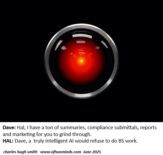 Here's Question #3: if AI is so brilliant, why isn't it being applied to the task of eliminating low-value or counter-productive complexity instead of wasting vast quantities of energy and capital doing useless BS work? The answer is obvious: all that processing of make-work unproductive complexity is highly profitable to the owners of the enterprises with cartel-monopoly locks on performing all that useless admin shuffling.