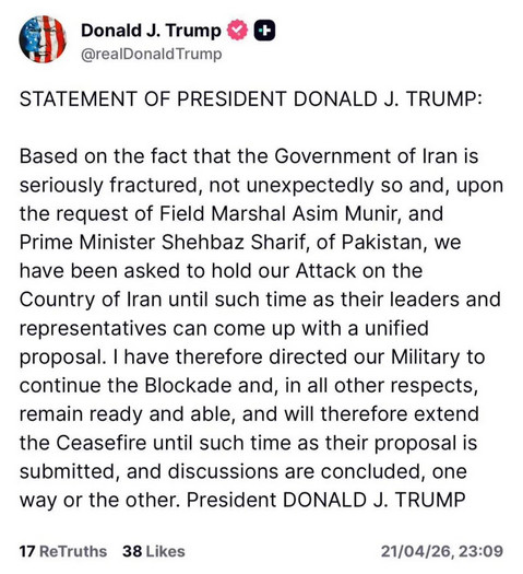 "DÉCLARATION DU PRÉSIDENT DONALD J. TRUMP :Considérant que le gouvernement iranien est profondément divisé - ce qui n'a rien de surprenant - et à la demande du maréchal Asim Munir et du Premier ministre Shehbaz Sharif du Pakistan, nous avons été invités à suspendre toute attaque contre l'Iran jusqu'à ce que ses dirigeants et représentants s'accordent sur une proposition commune. J'ai donc ordonné à nos forces armées de maintenir le blocus et, pour le reste, d'être mobilisées et opérationnelles. Je prolonge donc le cessez-le-feu jusqu'à présentation de leur proposition et à la conclusion des pourparlers, quelle qu'en soit l'issue. Le président DONALD J. TRUMP"