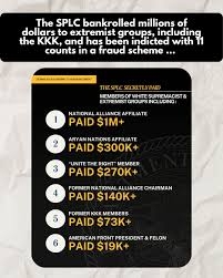 Un budget de cette taille crée une force gravitationnelle. Il attire institutions, réseaux et récits dans son orbite — et récompense ceux qui alertent le plus bruyamment sur le danger. Les enquêtes aux États-Unis contre le SPLC confirment cette thèse: l'organisation aurait payé plusieurs millions de dollars à des informateurs au sein du Ku Klux Klan et de groupes néonazis. Selon l'accusation, des membres dirigeants de groupes d'extrême droite auraient été secrètement financés par le SPLC, tandis que les donateurs étaient invités à soutenir la lutte contre ces groupes, l'argent étant dissimulé via des sociétés fictives.