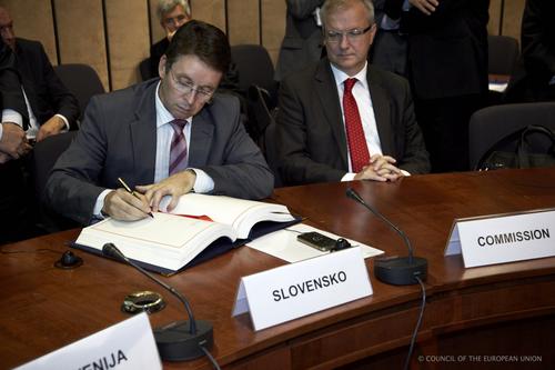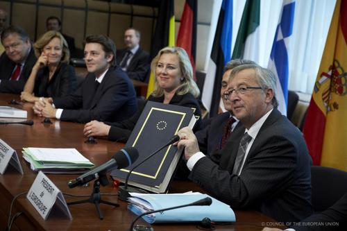 Le 11 juillet 2011 le traité était signé. Bien que la signature ait été annoncée plus tard ce jour-là, à l'ouverture d'une onférence de presse où assistaient des dizaines de journalistes, le lendemain on n'a pu trouver aucun titre sur la signature de ce nouveau traité européen, ni dans les jounaux Français, ni dans les journaux étrangers. Peut-être ça venait du fait que Juncker l'avait annoncé en français... avant de poursuivre la conférence de pressse en anglais?