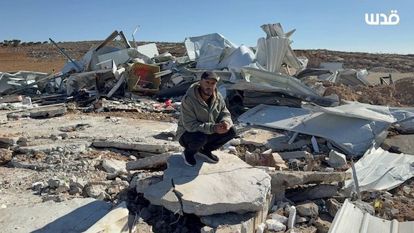 Les Palestiniens inspectent les ruines de plusieurs magasins démolis ce matin par les forces d'occupation israéliennes dans le village de Rammadin, au sud d'Hébron.