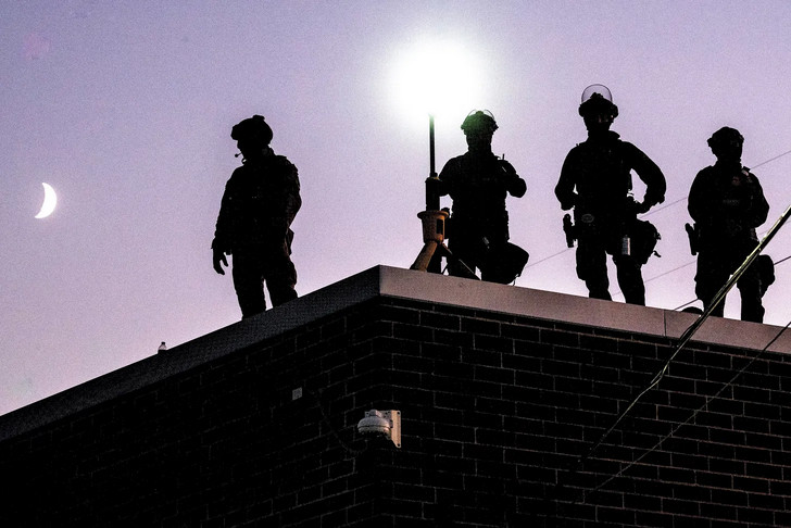 Des agents de l'ICE (Immigration and Customs Enforcement) sur le toit du centre de détention ICE de Broadview à Chicago, le 9 septembre 2025. (Paul Goyette /Wikimedia Commons/ CC BY 4.0)
