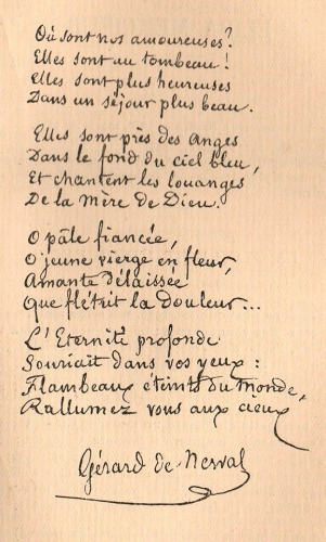 Nerval est tout poésie, c'est-à-dire création, et avant tout de lui-même – c'est peut-être là source de fatalité et de tragédie - ; son identité erratique suit les méandres de son écriture. Ce mystère s'est inscrit dans sa mort. Son suicide, à l'aube du 26 janvier 1855, dont les causes vraisemblables s'imposent au bon sens – la misère, la maladie, le froid extrême (-20°), la nuit angoissante, la solitude, l'abandon -, demeure néanmoins de tous ses actes le plus énigmatique et le plus paradoxal, si l'on s'en rapporte aux accents lumineux et positifs de la fin d'Aurélia, œuvre posthume, notons-le, qui survit à sa mort biologique, non sans ironie hoffmannienne.