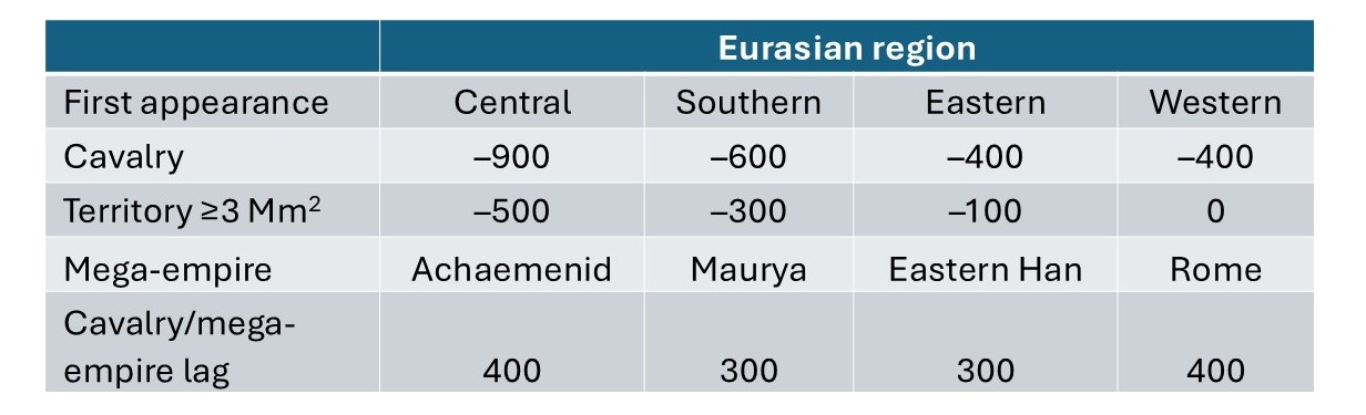 D'autres facteurs, tels que la métallurgie du fer (ou l'acier de Diamond), sont également importants, mais ils sont surpassés par la capacité à monter à cheval. Nous montrons que lorsque la cavalerie se répand dans une région, elle intensifie la compétition militaire entre les sociétés qui s'y trouvent. Puis, 300 à 400 ans plus tard, nous assistons à l'émergence d'empires d'une taille sans précédent. Voir le tableau ci-dessous.