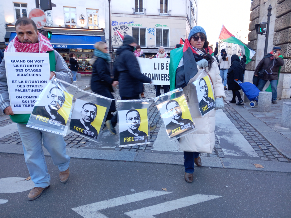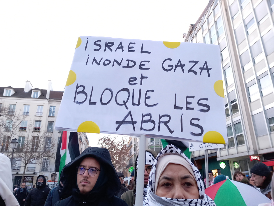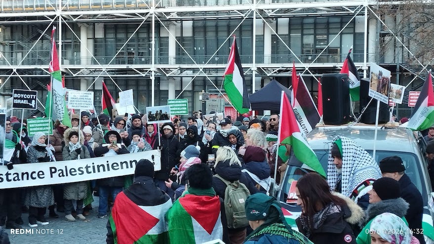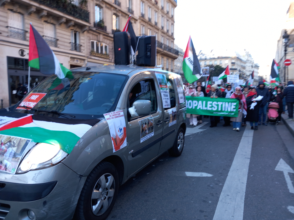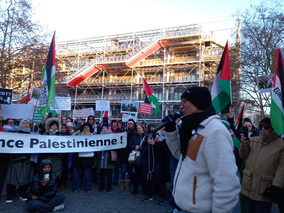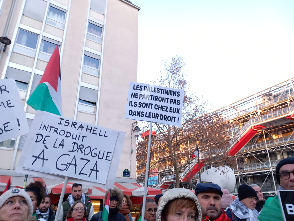 Plusieurs centaines de manifestant(e)s ont défilé samedi dans les rues de Paris, de la gare de l'Est à Beaubourg, pour alerter la population sur la situation dramatique en Palestine, et sur la complicité du gouvernement français face à la poursuite par Israël du nettoyage ethnique du peuple palestinien.