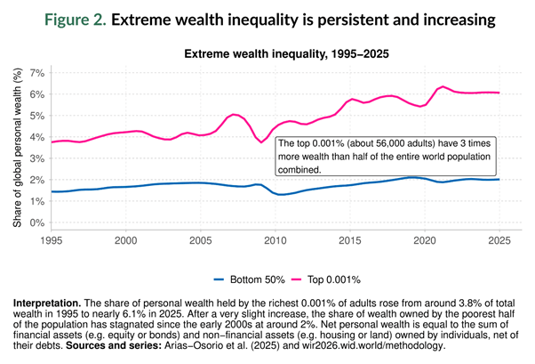 Esta concentración no solo es persistente, sino que también se está acelerando. Desde la década de 1990, la riqueza de las y los multimillonarios y centimillonarios ha crecido aproximadamente un 8 % anual, casi el doble de la tasa de crecimiento experimentada por la mitad más pobre de la población. La gente más pobre han obtenido modestas ganancias, pero estas se ven eclipsadas por la extraordinaria acumulación en la cima. La parte de la riqueza mundial en manos del 0,001 % más rico ha pasado de casi el 4 % en 1995 a más del 6 %, según el informe, mientras que la riqueza de las y los multimillonarios ha aumentado alrededor de un 8 % anual desde la década de 1990, casi el doble de la tasa del 50 % más pobre.