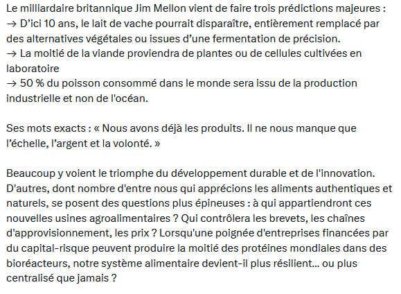 Bref, ces gens veulent la FoodTech. Tout est prêt pour nous servir leurs aliments synthétiques... Cependant, si cela devait mal tourner, ils sont producteurs des médicaments/vaccins pour vous soigner...