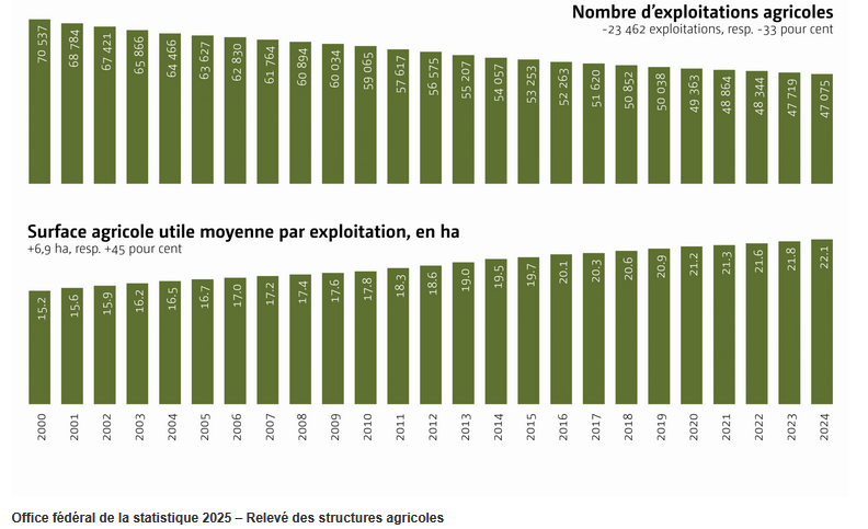 Toujours moins d'exploitations au profit d'entités plus grandes. «Le relevé des structures agricoles fait apparaître année après année la diminution continuelle du nombre d'exploitations agricoles en Suisse. L'année dernière, 644 fermes ont cessé leur activité, soit près de deux fermes par jour. Les petites et moyennes exploitations disparaissent, tandis que celles qui restent continuent de s'agrandir. Or une agriculture diversifiée et résiliente capable d'assurer l'approvisionnement a besoin de petites et moyennes exploitations. C'est pourquoi l'Association des petits paysans demande d'urgence l'abandon de la stratégie «croître ou disparaître» de la Confédération». petitspaysans.ch