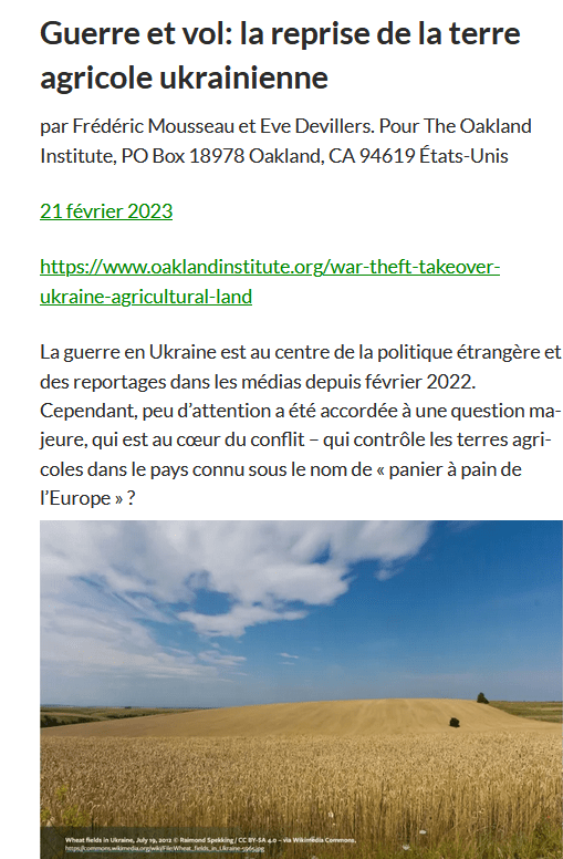 Guerre et vol : La prise de contrôle de la terre agricole de l'Ukraine expose les intérêts financiers et la dynamique en jeu conduisant à une concentration accrue de la terre et des finances. Extrait.