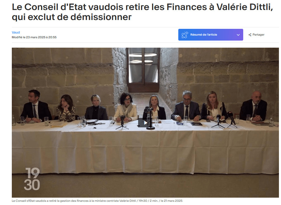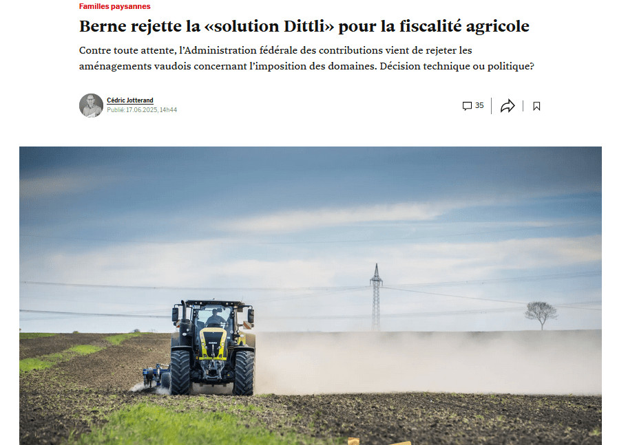 «Sur le terrain de la fiscalité agricole, qui empoisonne aussi bien la vie de dizaines de familles concernées que l'Administration cantonale des impôts (ACI), la solution dénichée par Valérie Dittli en ce début d'année - révélée par «24 heures» - vient de se prendre une sacrée gifle envoyée par Berne. Au détour d'une publication ce mardi dans la «Feuille des avis officiels», dévoilée par le quotidien « Le Temps», l'Administration fédérale des contributions ( AFC) indique en effet qu'elle n'a que peu goûté l'esprit d'indépendance des Vaudois dans ce dossier. Pour rappel, les agriculteurs qui cèdent leur exploitation - y compris sans échange d'argent dans le cadre familial - sont lourdement frappés par le fisc à la suite d'un changement de pratique dicté par un arrêt du Tribunal fédéral datant de 2011, raison pour laquelle des allégements ont été proposés par Valérie Dittli, alors chargée des Finances jusqu'ici». 24heures.ch