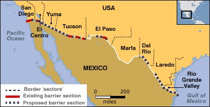 Le 4 octobre 2006 le président George W. Bush promulgue une loi pour la construction d'un mur sur la frontière qui sépare les États-Unis du Mexique et ce sur une longueur de 1200 kilomètres, soit près de 40% des 3200 kilomètres qui délimitent les deux pays. Cette entreprise n'est pas vraiment une nouvelle surprenante. C'est un souhait exprimé depuis des années par un grand nombre d'organisations qui luttent contre l'immigration clandestine provenant des pays latino-américains et, en particulier, du Mexique. Les Américains auront leur propre mur, le «mur américain», le mur du Sud qui est déjà considéré par les Mexicains comme étant le «mur de la honte» et qui s'avère, en fait, l'expression d'un processus de militarisation de la frontière entre les deux pays