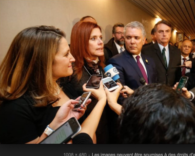 Cette collaboration était évidente le 23 janvier, jour de la déclaration de Guaidó comme président par intérim, lorsque plusieurs pays du Groupe de Lima ont annoncé leur soutien au leader vénézuélien, lors du Forum économique mondial à Davos, en Suisse. Madame Freeland se tenait aux côtés de M. Bolsonaro, ainsi que du président colombien Iván Duque et de la vice-présidente péruvienne Mercedes Aráoz, alors qu'à tour de rôle ils ont exprimé leur soutien à Guaidó au nom de leur alliance.