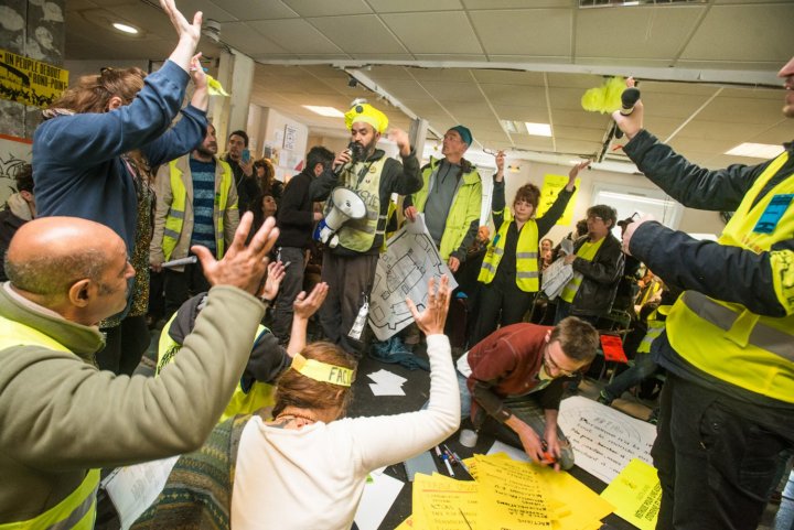 Ce sont près de 800 personnes délégués de 200 groupes locaux, observateurs non mandatés, bénévoles, journalistes qui se sont retrouvées vendredi 5 avril dans « la Maison du peuple », une ancienne agence pour l'emploi occupée depuis plusieurs mois par les Gilets jaunes de Saint-Nazaire. La mairie avait refusé de prêter un local, et fait pression sur les communes avoisinantes pour empêcher toute aide, si bien que les Gilets jaunes de la ville portuaire ont choisi de tenir l'assemblée dans leur maison.