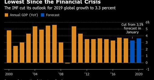 Le FMI estime que l'économie mondiale connaîtra une croissance de 3,3 % cette année, en baisse par rapport aux 3,5 % prévus pour 2019 en janvier. C'est la troisième fois que le FMI abaisse ses perspectives en six mois. La nouvelle économiste en chef du FMI, Gita Gopinath, a estimé que l'économie mondiale était entrée dans « un moment délicat ». Elle a donné un aperçu décisif : « Si les risques de dégradation ne se matérialisent pas et si le soutien politique mis en place est efficace, la croissance mondiale devrait rebondir. Si toutefois l'un des risques majeurs se concrétisait, les redressements attendus dans les économies en difficulté, les économies dépendantes des exportations et les économies fortement endettées pourraient être déraisonnables. » Donc, d'un côté ou de l'autre....
