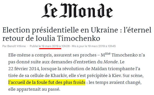 « En réalité, et c'est une première en Ukraine, le scrutin ne met pas aux prises pro-européens et prorusses - le candidat représentant cet électorat, Iouri Boïko, est relégué à une lointaine quatrième place -, mais ce qu'il faut comprendre, c'est que face à un Zelenski inexpérimenté et une Timochenko réputée trop souple face au Kremlin, seul le président peut tenir le cap « euro-atlantique ». Aucun costume ne lui sied mieux que celui de commandant en chef des armées. [...]