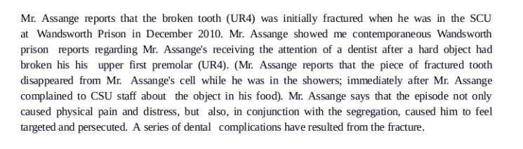 La dernière fois qu'Assange a été détenu dans une prison britannique, en 2010, il dit qu'on lui a donné de la nourriture contenant des objets métalliques qui ont gravement endommagé une dent. C'était à la prison de Wandsworth de Londres. L'incident a causé de graves blessures et il n'a pas reçu de soins médicaux appropriés pendant les six ans et demi qui ont suivi son incarcération à l'ambassade équatorienne. Un rapport médical publié par WikiLeaks en 2015 décrit la version d'Assange de l'événement :