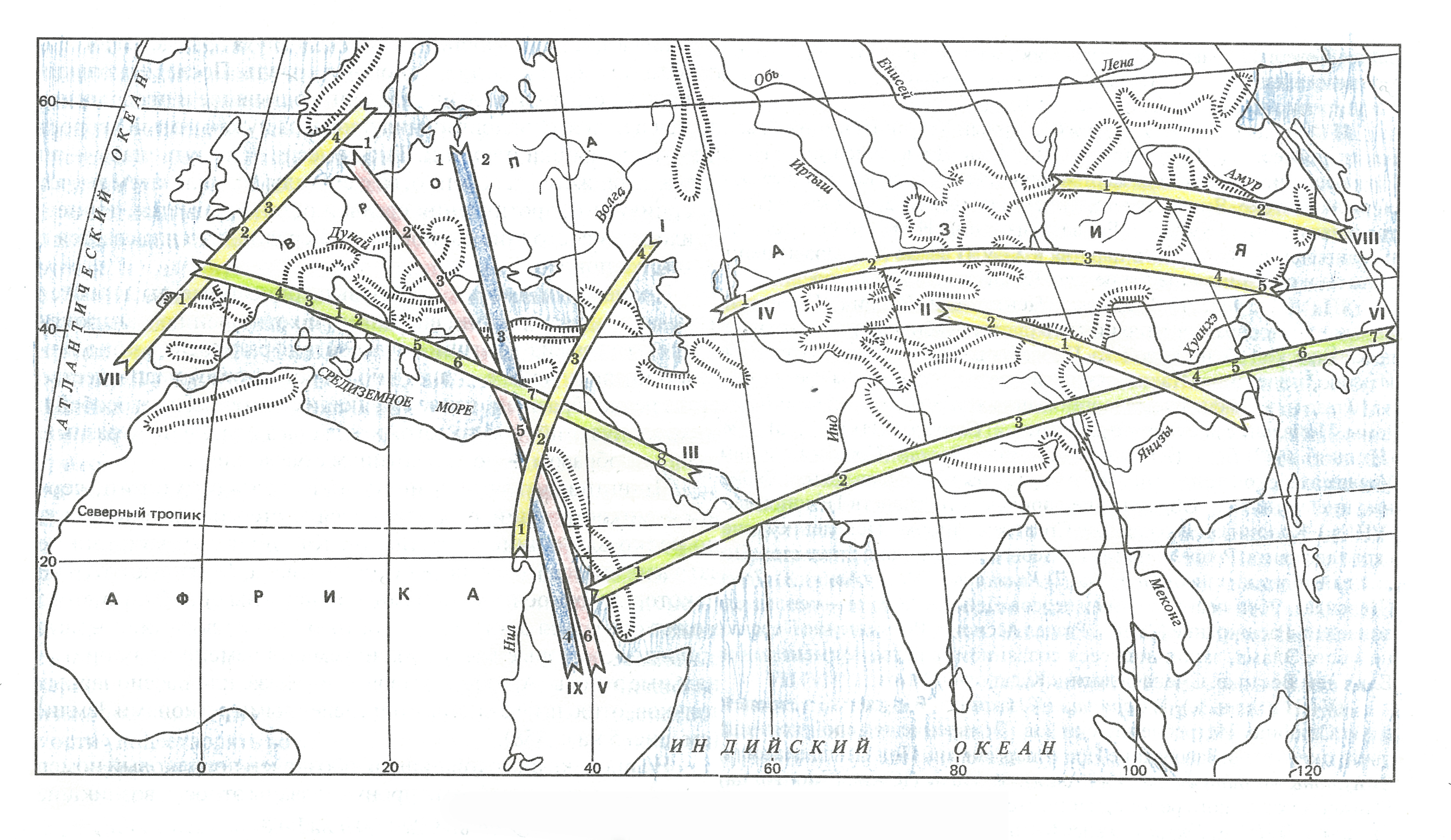 La carte est en russe mais les chiffres romains et arabes ne le sont pas, pas plus que les formes des côtes, rivières et montagnes. Voici donc la liste complète des neuf occasions où des humains en Eurasie ont été poussés par les rayonnements venant de l'espace à faire des choses historiquement importantes.