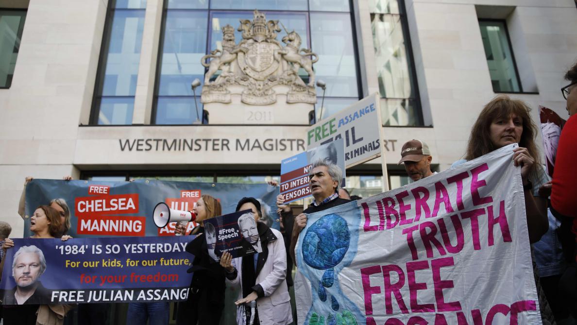 Des partisans de Julian Assange manifestaient jeudi 30 mai devant le tribunal de Westminster, qui devait examiner la demande d'extradition des USA. En raison de la mauvaise santé d'Assange, l'audience a été reportée à la semaine du 12 juin. Photo AFP.