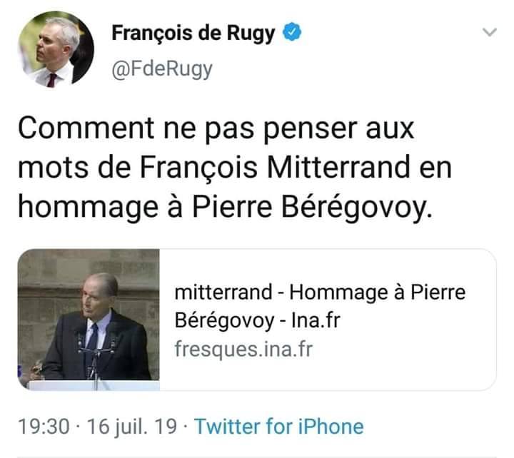 Touitteur : « Comment ne pas penser aux mots de François Mitterrand en hommage à Pierre Bérégovoy » (François de R., indic, rabatteur, prébendier puis cocu).