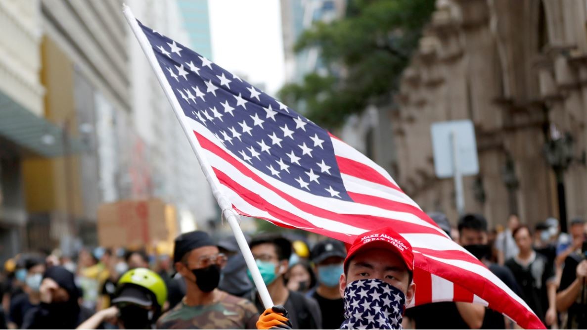 © Kim Kyung-Hoon Source: ReutersUn manifestant porte un drapeau américain lors d'une manifestation du 3 août à Hong Kong.