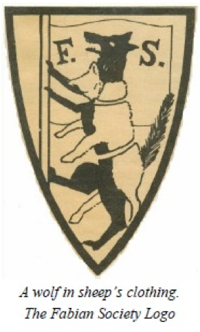 La Fabian Society fut fondée en 1884 par une clique élitiste de propagandistes darwiniens qui voyaient dans le système récemment publié par Karl Marx, le véhicule parfait pour insérer la logique de Darwin dans la structure des croyances populaires. En fait, tous ses membres étaient de fervents racistes obsédés par la mission de convaincre l'humanité de se soumettre à un nettoyage racial selon les idées émises par le darwinisme social de Herbert Spencer et l'eugénisme de Francis Galton. Spencer et Galton étaient tous deux étroitement dirigés par le X Club de Thomas Huxley, à ce stade entièrement en charge de la politique scientifique impériale. Notons que l'étrange symbole de la Fabian society représente un loup sous une peau de mouton.