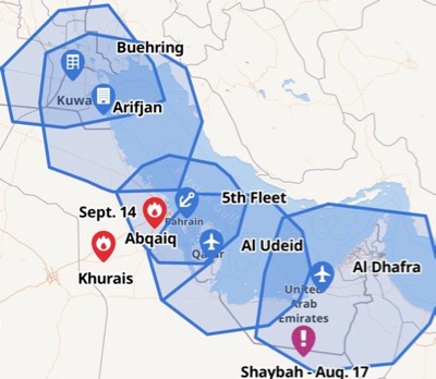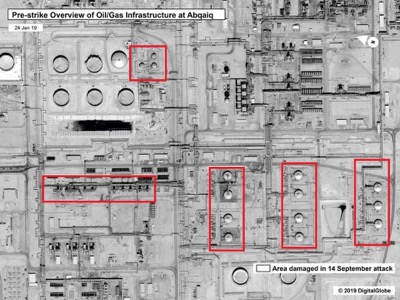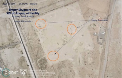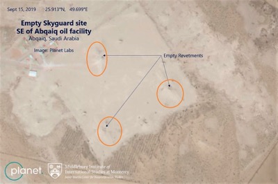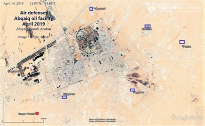 Les États-uniens ont commencé à analyser méthodiquement l'attaque de drones yéménites contre ces installations pétrolières, d'autant plus que leurs systèmes anti-aériens les plus performants étaient impliqués. Le rapport est secret mais l'Institut d'études internationales Middleburry de Monterey a publié plusieurs photos satellites déclassifiées du système de défense de la raffinerie d'Abqaiq, avant l'attaque. En ce qui concerne la raffinerie d'Abqaiq qui a été touchée par des drones yéménites, le dispositif de défense directe a été installé par les États-Unis (photo ci-dessus). Dans un rayon de 10 km autour de la raffinerie, ont été placées 2 batteries de grande portée Patriot PAC-2/3, une batterie de missiles à courte portée Shahine-Crotale et 3 sections d'artillerie avec radar de type Oerlikon et caméras Skyguard.