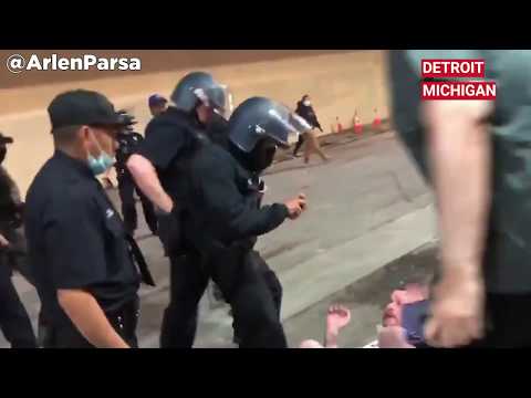 Une vidéo tournée par des habitants de Minneapolis samedi soir montre la police défilant derrière un Humvee de la Garde nationale en criant aux gens d'entrer et criant «Allumez-les». Les policiers tirent des balles en caoutchouc sur un groupe de jeunes rassemblés devant leur maison. Des membres du département de police de New York ont lancé leurs véhicules dans une foule de manifestants à Brooklyn. Un vieil homme blanc marchant avec une canne a été jeté au sol par la police antiémeute de Salt Lake City alors qu'elle descendait la rue dans des véhicules blindés en dispersant les manifestants.