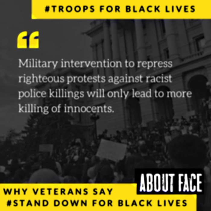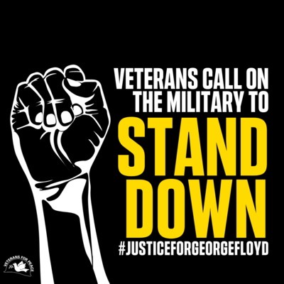 L'organisation des vétérans de anti-guerre About Face: Veterans Against the War [Demi-tour : Vétérans contre la guerre] a fait circuler une pétition destinée aux membres de la Garde nationale qui dit « Nous vous demandons de défendre la vie des Noirs en vous retirant. Nous connaissons les conséquences que vous pourriez subir si vous désobéissez aux ordres. Beaucoup d'entre nous y ont fait face eux-mêmes ». Au 4 juin, quelque 700 vétérans avaient signé cet appel à refuser le service. (( source)