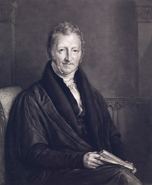 Fils d'un gentilhomme campagnard, Thomas Malthus (1766-1834) était un membre de l'Université de Cambridge, vicaire de l'Église d'Angleterre et plus tard professeur à une université privée créé par la Compagnie des Indes orientales pour former ses administrateurs. Il devint une figure de premier plan de la politique bourgeoise avec sa publication en 1798 de son Essai sur le principe de la population ou esposé des effets de cette cause sur le bonheur du genre humain.