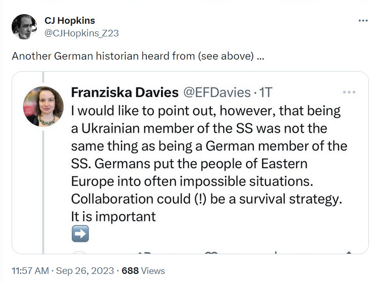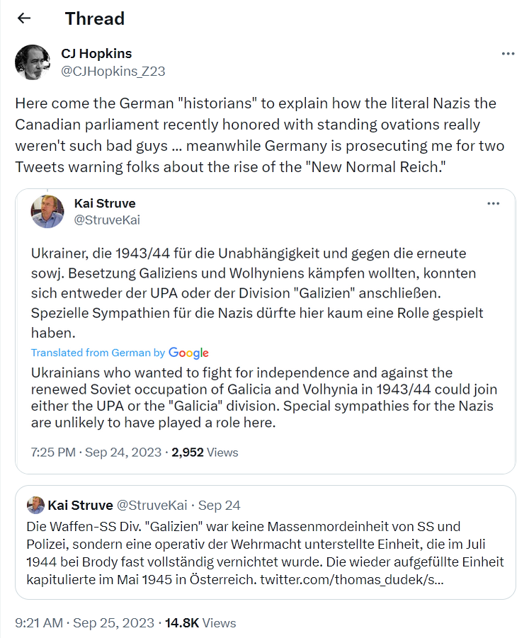Anyway, someone drew attention to Yaroslav Hunka's Nazi history, and the shit hit the fan on social media. The stink soon spread to the corporate and state media, which had no choice but to get on the bandwagon. They couldn't get away with ignoring the story, so they were forced to report it, and spin it as a "blunder."